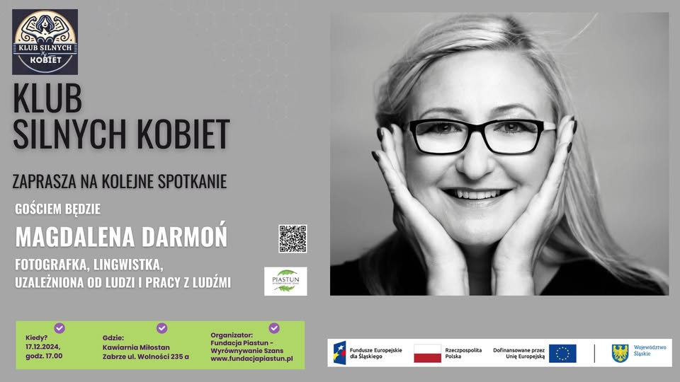 Fundacja Piastun Wyrównywanie Szans zaprasza do Miłostanu na kolejne spotkanie Klubu Silnych Kobiet, które odbędzie się 17 grudnia 2024r od godziny 17:00. Spotkanie poprowadzi fotografka Magdalena Darmoń.