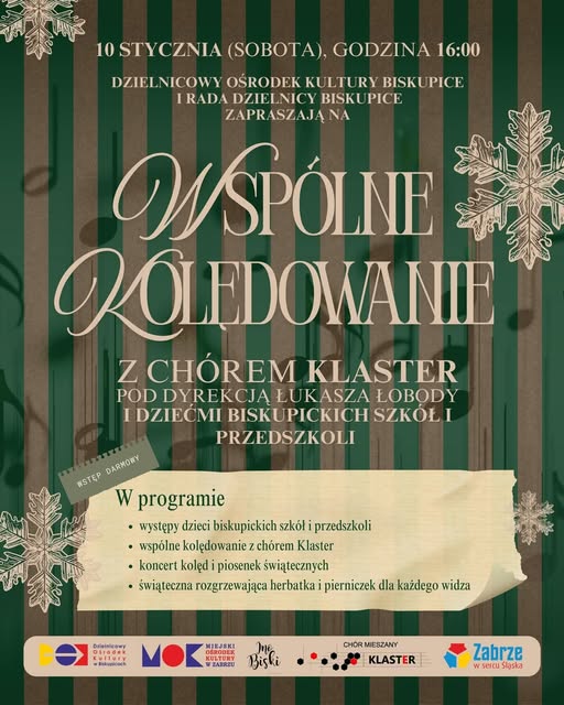 Dzielnicowy Ośrodek Kultury Biskupice ul. W. Kossaka 23, Zabrze, śląskieDzielnicowy Ośrodek Kultury Biskupice oraz Rada Dzielnicy Biskupice zapraszają na wspólne kolędowanie w DOK Biskupice. Ten wyjątkowy wieczór uświetni…