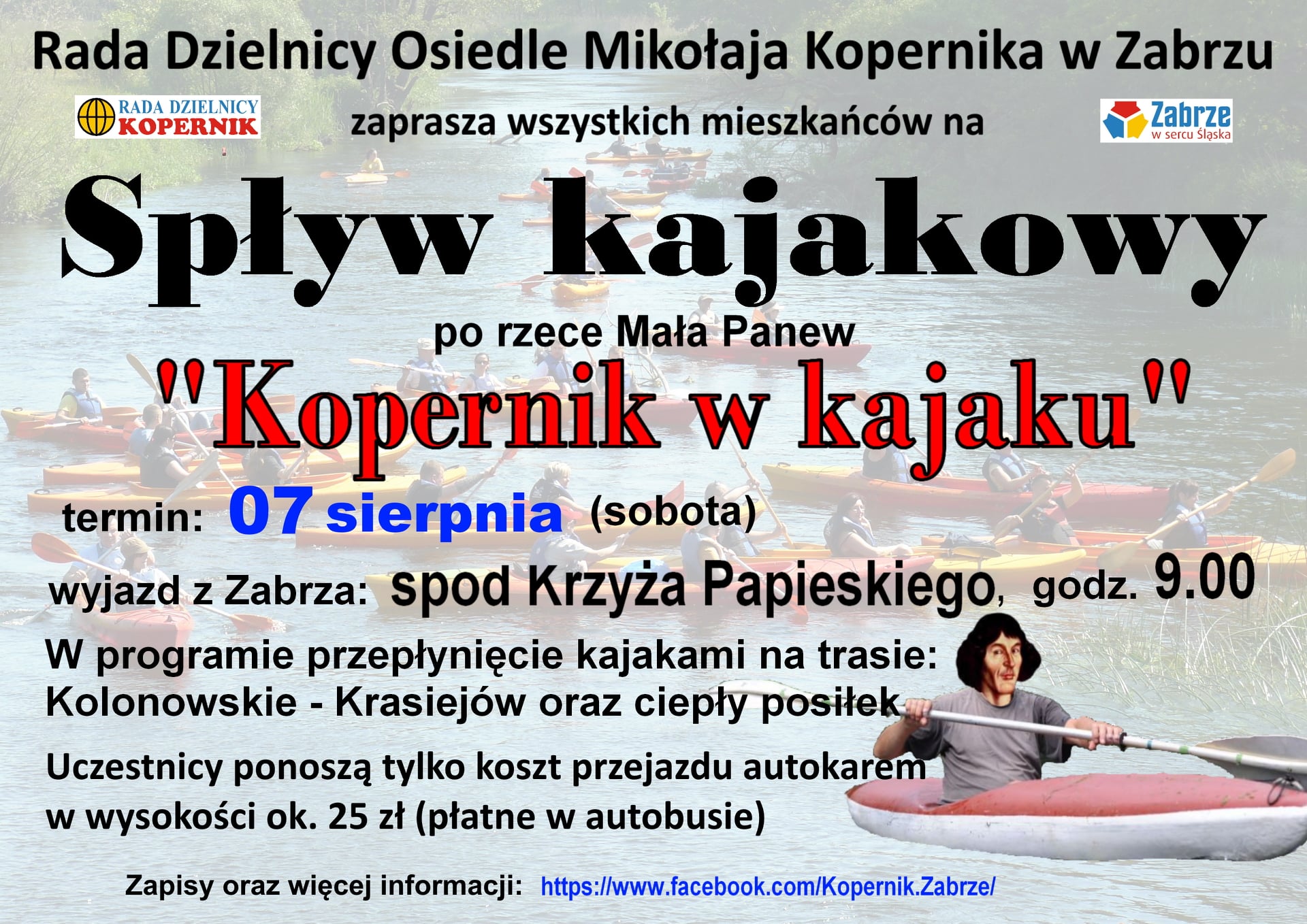 Zarząd Dzielnicy Osiedle Mikołaja Kopernika zaprasza wszystkich mieszkańców Zabrza na spływ kajakowy po rzece Mała Panew.