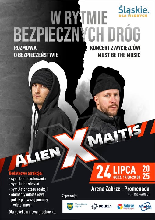 Serdecznie zapraszamy na wyjątkowe wydarzenie, które połączy muzykę, pozytywne emocje i edukację z zakresu bezpieczeństwa. Już w czwartek, 24 lipca 2025 r. w godzinach od 17:00 do 20:00, na Promenadzie przy Arenie Zabrze odbędzie się spotkanie z udziałem znanego duetu Alien BSC x Majtis – zwycięzców programu „Must Be The Music”.
